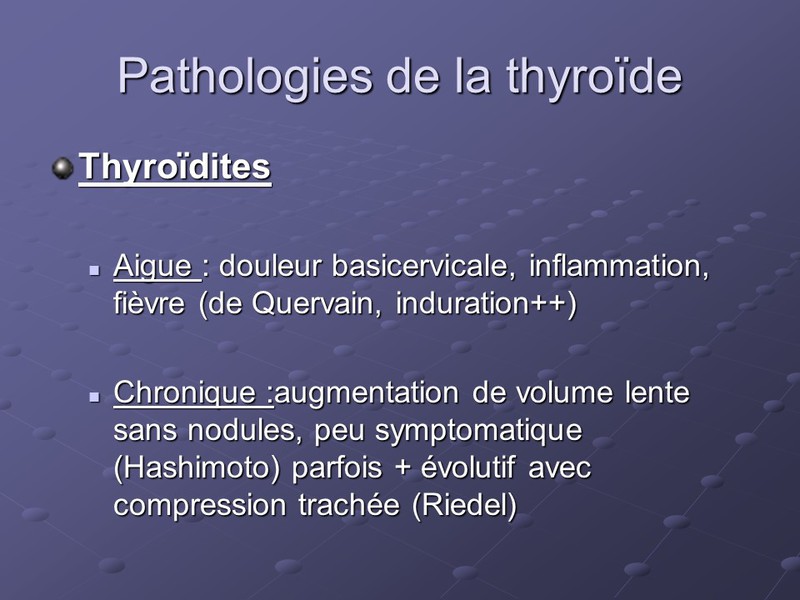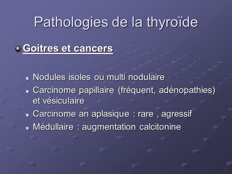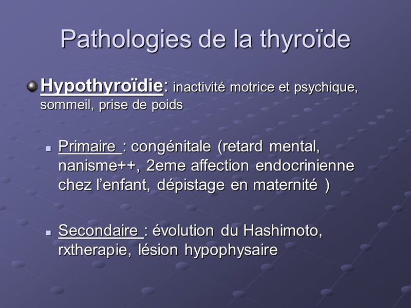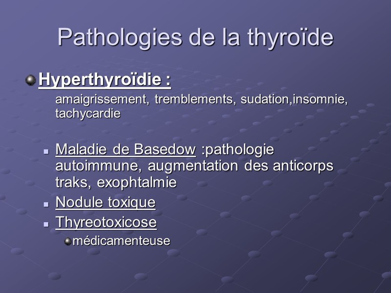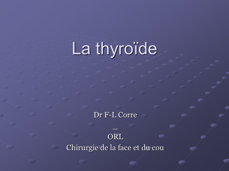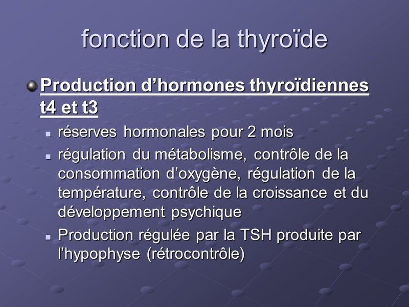 La thyroïde est une glande cervicale qui produit une hormone nécessaire au métabolisme basal et à la synthède des protéines.