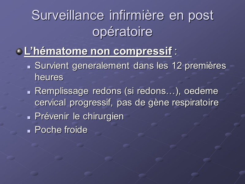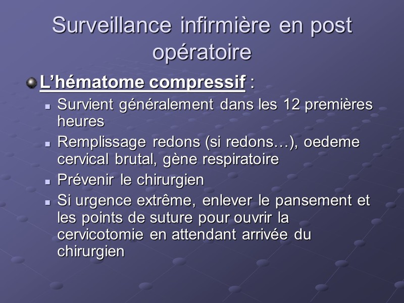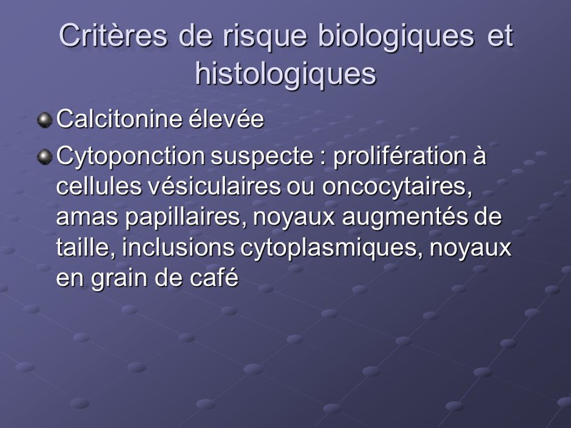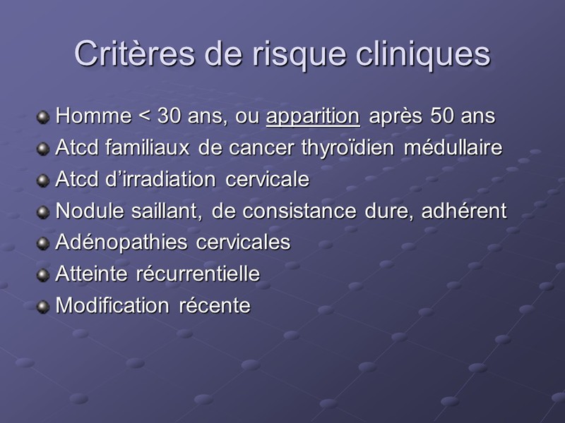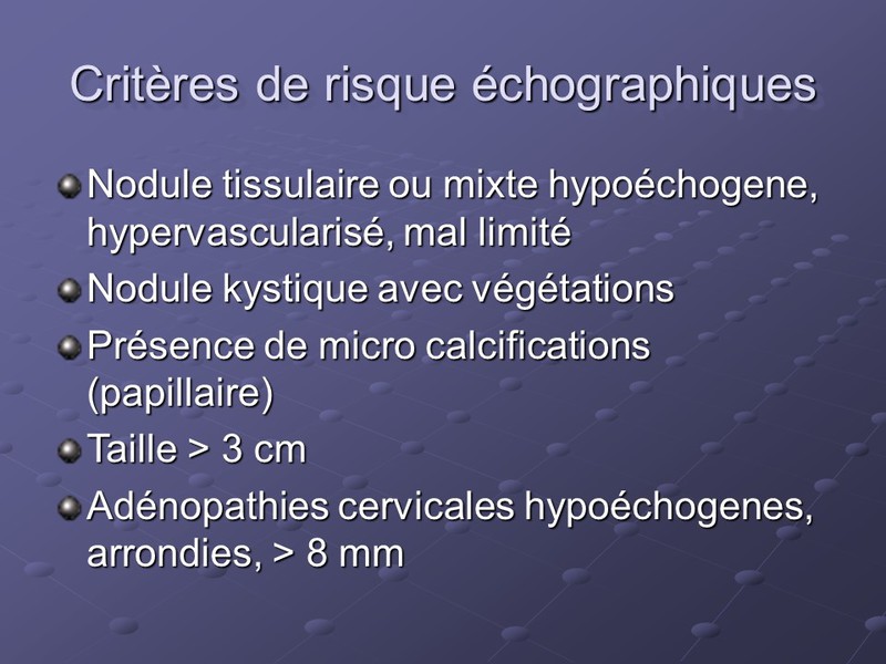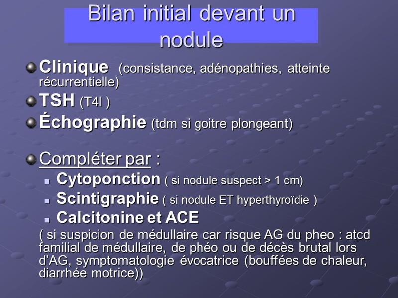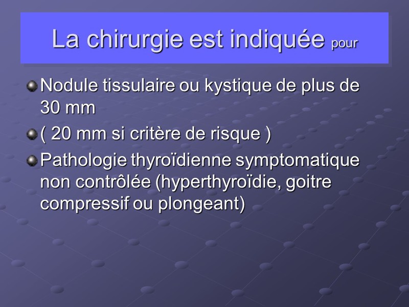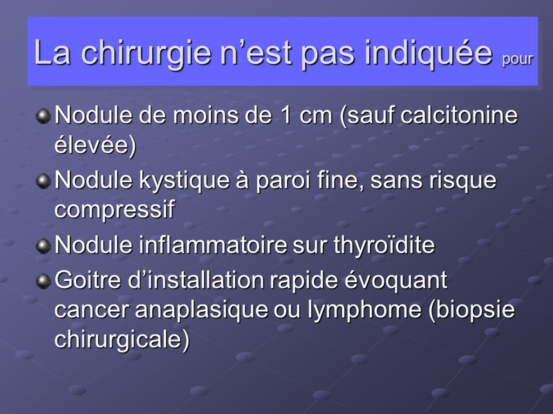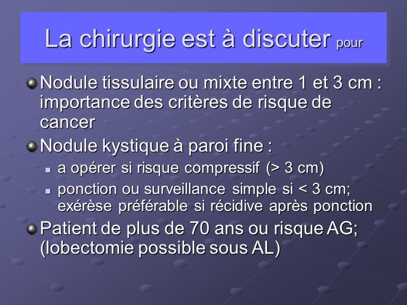 - Nodules thyroïdiens: ces nodules peuvent être bénins (le plus souvent) ou malins. Leur exérèse est généralement décidée en cas de signe d'inquiétude quant à leur nature (échographie), ou lorsqu'ils deviennent trop gros, compressifs ou esthétiquement gênants. L'intervention permet une analyse histologique de ces nodules.