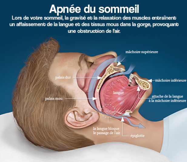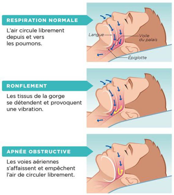 Le rétrécissement des voies aériennes supérieures est dû à un relâchement des tissus situés à l’arrière de la gorge (langue, luette, voile du palais).